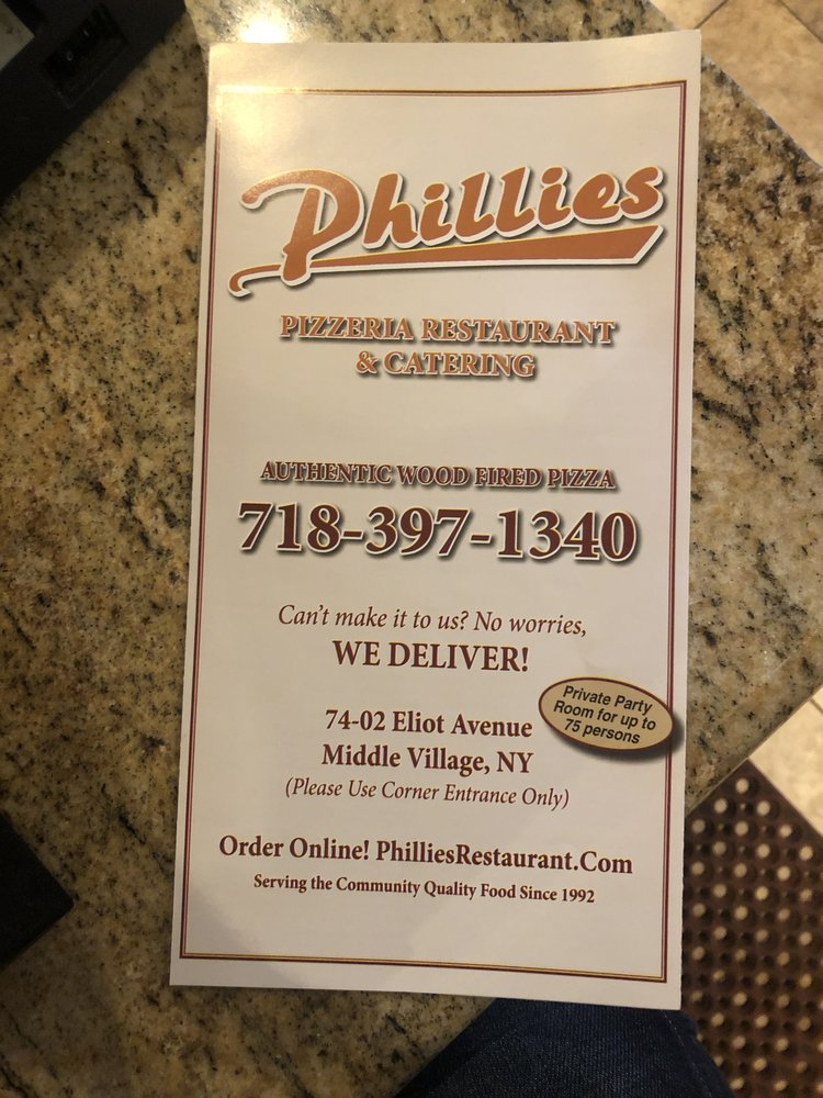 Welcome to Phillies Pizza & Restaurant, a cozy Italian spot in Middle Village, NY. This family-friendly restaurant offers a wide array of pizza options, including Neapolitan and Sicilian styles, along with unique specialties like Margherita and Capricciosa. Reviewers rave about the crispy yet soft crust, flavorful cheese, and perfectly balanced sauces. The menu also includes pasta dishes, sandwiches, and salads, catering to all tastes. The casual atmosphere and friendly service make it a perfect spot for lunch, dinner, or group gatherings. The location offers street parking and wheelchair accessibility, making it convenient for all diners. Whether you're craving a classic cheese pizza or an adventurous Quattro Formaggi, Phillies Pizza & Restaurant has something to satisfy every palate.